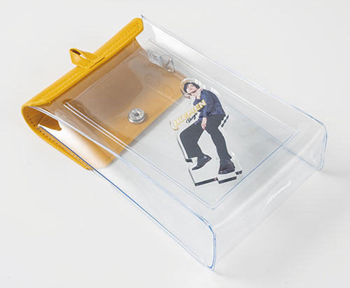 フラップは全5カラー、クリアボディで“ぬい”もグッズも映えるPVCポーチ。内側ポケットにはアクスタやトレカが収まり、側面のリングでチャームも付けられる推し活仕様!